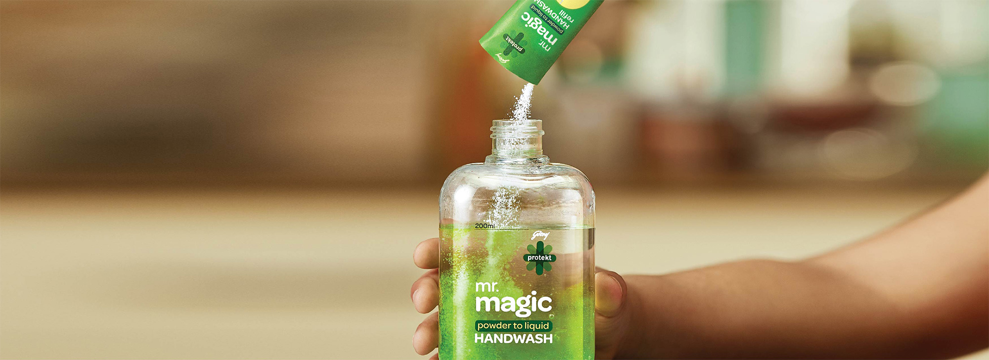 Godrej Protekt mr. magic - a first of its kind powder-to-liquid handwash - is our innovative, sustainable new solution to cleaner hands